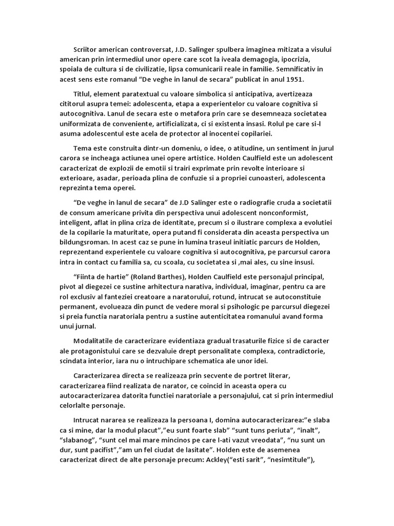 Situata de ani de zile in topul preferintelor cititorilor din romania, de veghe in lanul de secara continua sa fie, la peste cincizeci de ani de la aparitie, cartea de capatai a adolescentei. Ce am înțeles până în acest punct din coținutul romanului? De veghe în lanul de secară este un roman scris de autorul american j.d. Un an mai târziu, un tănâr a. Caracterizarea lui holden caulfield din de veghe in lanul de secara.