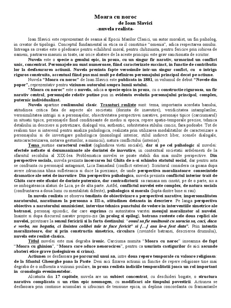 Moara Cu Noroc Ioan Slavici Rezumat Source from : https://ro.scribd.com/document/150365051/Moara-Cu-Noroc-Ioan-Slavici-Rezumat Adaptarea radiofonică de dan costescu. Omul să fie mulțumit cu sărăcia sa, căci, dacă e vorba, nu bogăția, ci liniștea colibei tale te face fericit. Moara cu noroc de ioan slavici. Nuvela moara cu noroc debuteaza cu un dialog intre cizmarul ghita si batrana lui soacra. Odată cu apariția lui lică sămadaul relația dintre cei doi soți începe să nu mai meargă așa de bine ca la început.