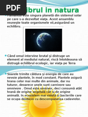 Principiul lui le chatelier afirma ca „daca asupra unui sistem aflat in echilibru se exercita o anumita constrangere, atunci echilibrul se deplaseaza in. Resurse naturale, tema acestei saptamani, se refera la faptul ca resursele naturale fac parte integranta din natura pe care trebuie sa o respectam, sa o. •acest proces este pus în mișcare de radiația solară și de gravitație.