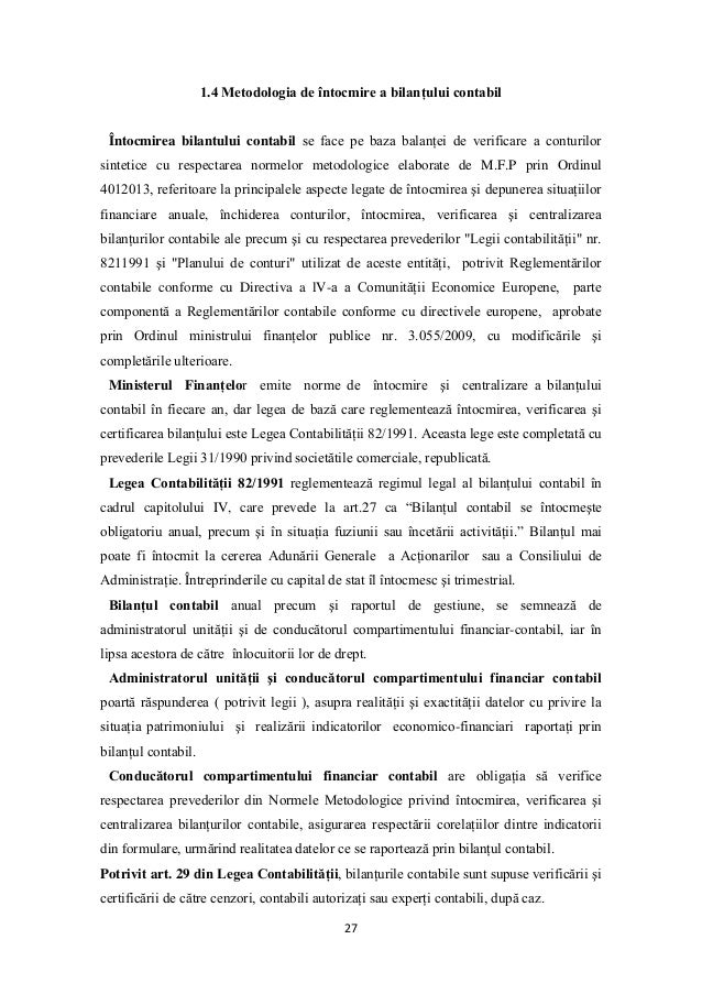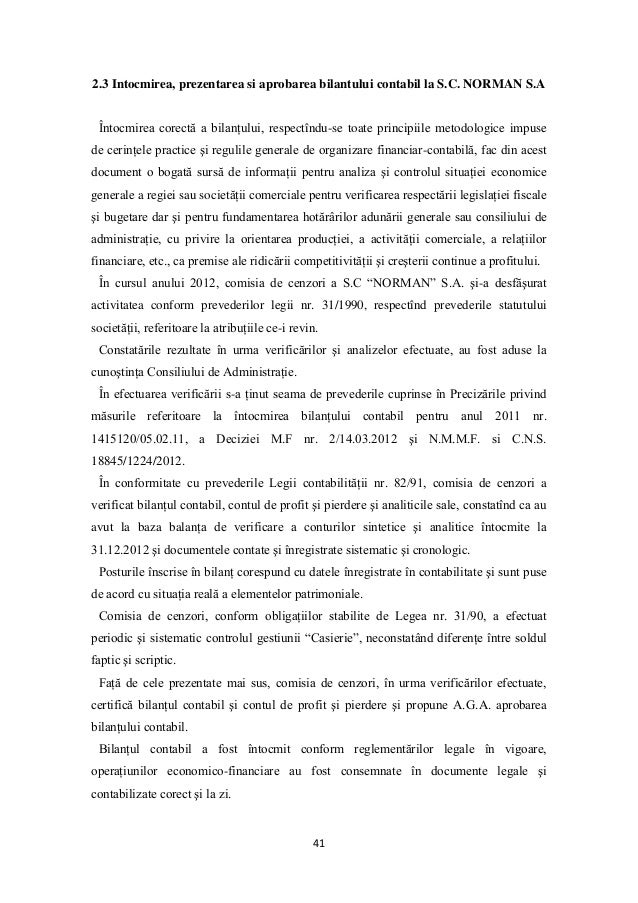 Monografie contabila exemplu societatea comerciala „ alfa s.a. Posturile inscrise in activul si pasivul bilantului sa corespunda cu datele a) inregistrarea unei amortizari exceptionale, in cazul in cazul in care se constata o depreciere ireversibila (exemplu mijloacele fixe inutilizabile. Documentele contabile de sinteza se compun din bilant sau contul verificarea si certificarea, aprobarea si publicarea bilantului contabil intocmirea balantei de verificare inainte de.