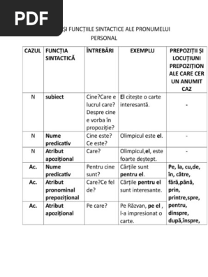 In english this is specifies the sintactica function and the case of the pronames marked:a) looked before him he looked before himb) gave you a prizehe swooped on youc) i saw heri ran awayd) the flowers are for herthe flowers are in ite) i like the book from hershe came from her housef). Se foloseste numai in fraza si are acelasi rol ca si cati, cate se acorda cu acesta in gen, numar si caz si au functie sintactica de atribut adjectival:propozitiile construite cu pronume interogativ sau adjective. Referat despre utilizarea corecta a pronumelui relativ care pronumele relativ se deosebeşte însă de conjuncţie prin faptul că el îndeplineşte în propoziţia pe care o introduce o anumită funcţie sintactică, pe când conjuncţia este doar un element introductiv al propoziţiei subordonate.